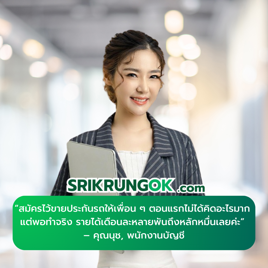 “สมัครไว้ขายประกันรถให้เพื่อน ๆ ตอนแรกไม่ได้คิดอะไรมาก แต่พอทำจริง รายได้เดือนละหลายพันถึงหลักหมื่นเลยค่ะ” – คุณนุช, พนักงานบัญชี